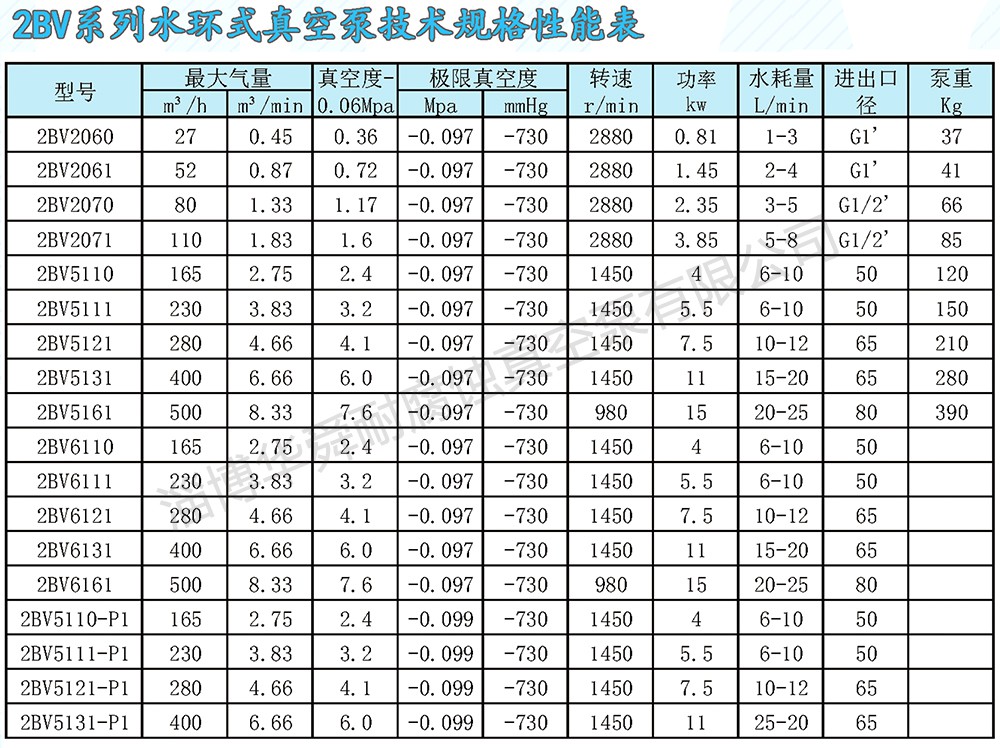 2BV系列真空泵是在我國傳統水環真空系的基礎上采用新技術開發的升級換代產品。它采用機泵同軸直聯式設計,可靠性高,易于安裝和維護,比傳統真空系體積少30%。它運行平穩,暻音低于62分貝具有自吸能力,便于操作。因采用了無油設計,使它基本上免于維護,因為采用了機被密封,從而消除了泄潮。該泵配的氣水分商50%的工作液可循環使用,我少了污染,降低了運行成本。該泵采用青銅葉輪提高了泵的耐腐蝕性。根據用戶要求,采用不銹鋼材質,會在惡劣的環境下正常運轉。因而廣泛適用于化工、醫藥、食品、造紙鋼鐵等行業。