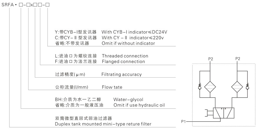 注:*為過濾精度,若使用介質(zhì)為水一乙二醇,帶發(fā)訊器,則過濾器型號為:SRFA·BH-63x*L-Y,濾芯型號為SFAX·BH-63x*。