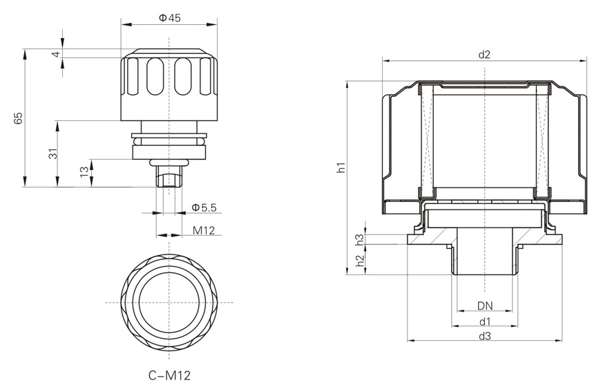 | 公稱通徑 | d1 | d2 | d3 | h1 | h2 | h3 | 空氣流量(m3/min) | ||