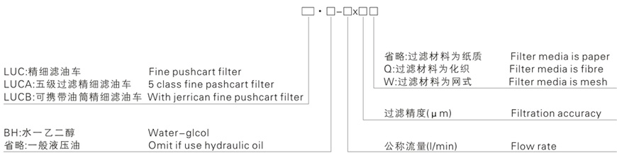 (1)*為過濾精度。若使用介質(zhì)為水一乙二醇時(shí),公稱流量63L/min,過濾精度5μm,過濾材質(zhì)為紙質(zhì)時(shí),濾油車的型號(hào)為L(zhǎng)UC·BH-63x5或 LUCA·BH-63X5,精濾器濾芯的型號(hào)為CZX·BH-63X5或 CZXA·BH-63X5。